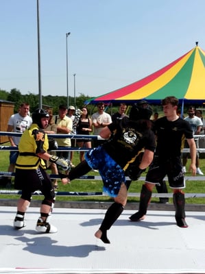 Beim jährlichem Sportfest des SV am Sportzentrum Laberau, hat die Kickbox- und Karategruppe einen Einblick in die Vielfalt ihrer Abteilung gegeben. Nach dem Einmarsch und Auftritt des Maskotchen Sun-Ching vermittelte die Mitglieder, wie sie ihre Fitness und Beweglichkeit trainieren. Nach dem Aufwärmen wurde eine traditionelle Form, die "Heian Shodan Kata", von allen gezeigt. Es folgte die Aufführung einer Waffenkata. Im Anschluss wurde ein abteilungsinternes Tunier um den Rumble-Champion, sowie den Lion-King im Leicht- und Semikontakt durchgeführt.