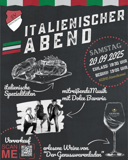 Am Samstag, den 20.09.2025, laden wir euch zu einem unvergesslichen Abend voller italienischer Köstlichkeiten und mitreißender Musik ein!