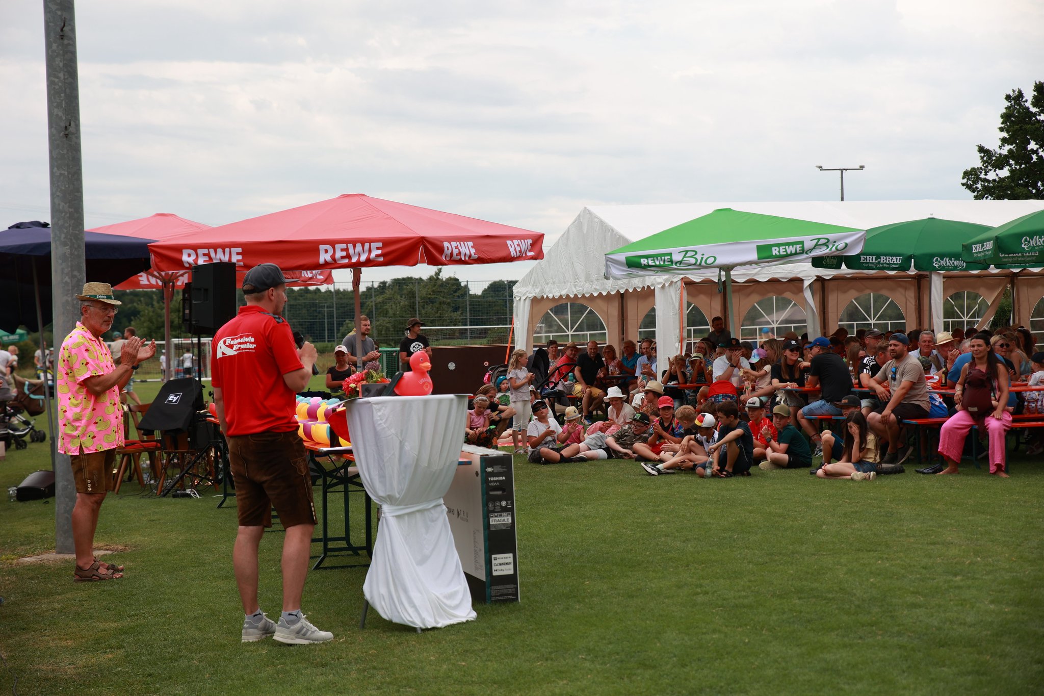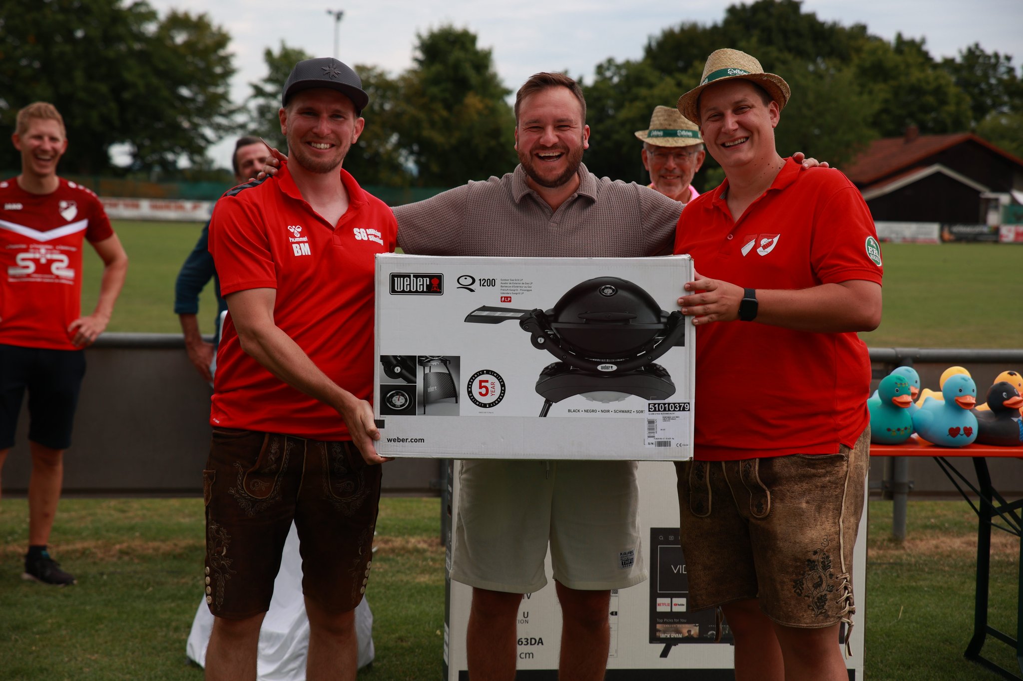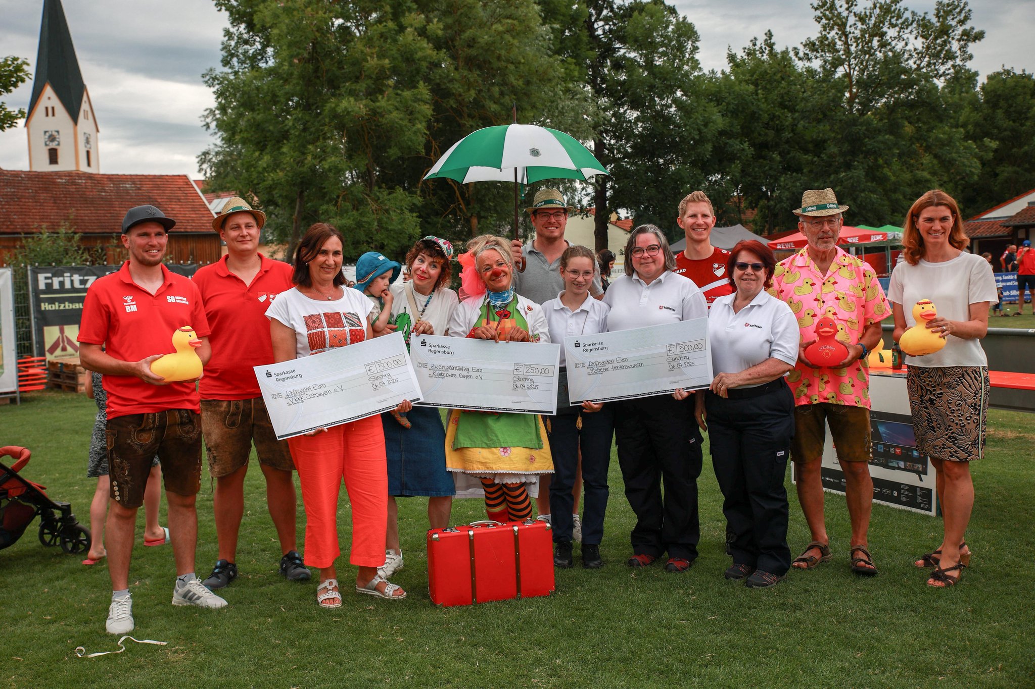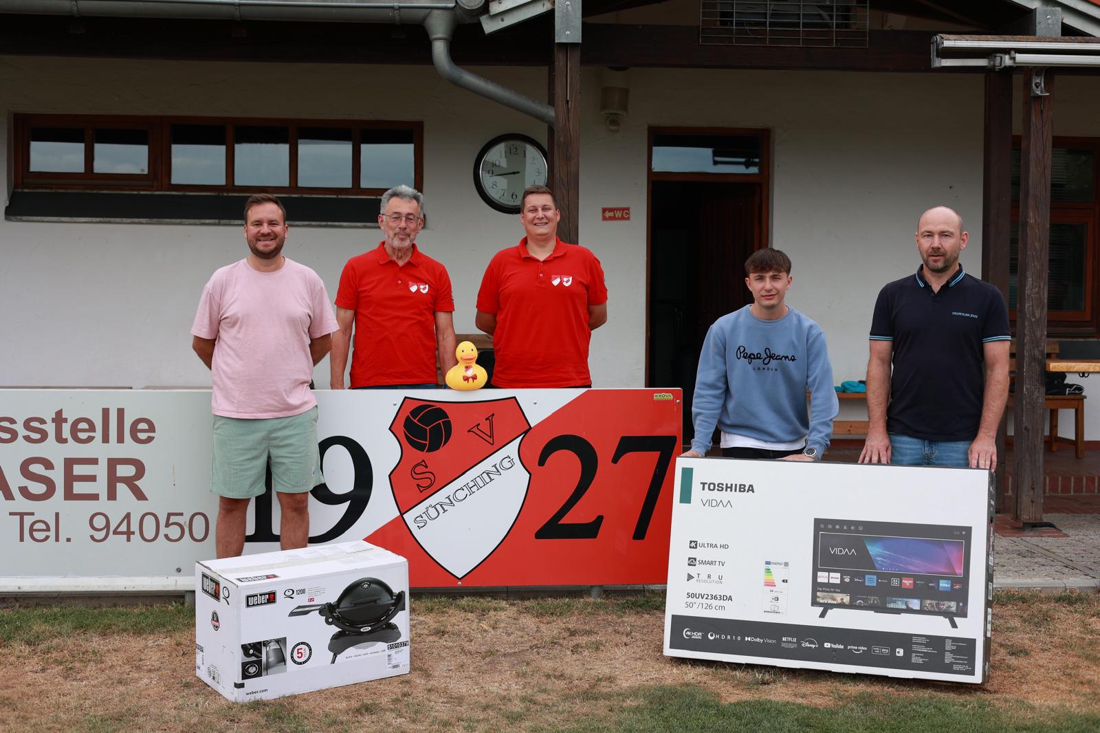 Die schnellste Ente mit der Nummer 824 gewann den ersten Preis – einen 50-Zoll-Fernseher – gefolgt von der Nummer 36, die den zweiten Platz belegte. Insgesamt gab es 173 Preise zu gewinnen! Mit unserem Slogan „1250 Jahre Sünching – 1250 Euro Spenden“ spendete der Sportförderverein Sünching den Erlös nach der Siegerehrung an verschiedene wohltätige Organisationen: den VKKK Regensburg (Kinderkrebshilfe), die Malteser Regensburg für das Projekt „Herzenswunsch erfüllen“ sowie die Kliniclowns. Der Rest des Reingewinns fließt in die Jugendarbeit des SV Sünching.