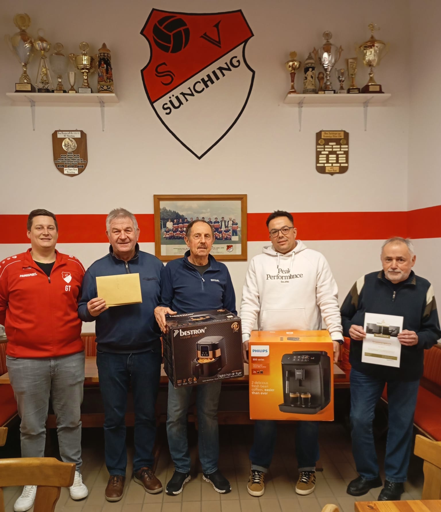 von links: 2. Vorstand Thomas Gstettner, Franz Feiertag gewinn ein Tagesticket für 2 Personen Therme Erding, Hans Schneider eine Heißluftfriteuse, Blüml Christian den Kaffeevollautomaten und Günther Hohler einen Yogagutschein für 12 Trainingseinheiten. Herzlichen Glückwunsch!