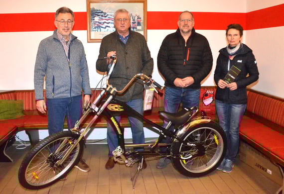 Die Preisträger der 3. Weihnachtstombola 2023. Von links Vorstand Helmut Jende, Herrlich Udo gewann das Chopper Bike, gestiftet von BIKEZEIT Neutraubling, Franz Hüttenkofer ein aktiver TT Spieler beim SV Sünching gewann die 4-tägige Berlinreise für 2 Personen, gestiftet vom CSU Büro Rüdiger Aumer, Regensburg und Ute Bronold einen Acer Aspire PC von der IT Box in Geiselhöring. DANKE an dieser Stelle an alle Loskäufer, Losverkäufer und natürlich ein herzliches Dankeschön den vielen Sponsoren.