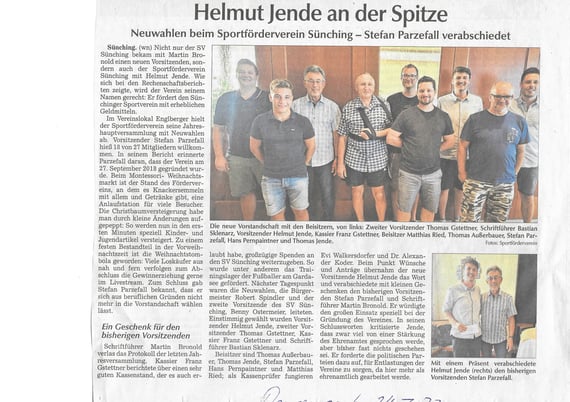 Am vergangenen Sonntag fand die diesjährige Jahreshauptversammlung des Sportfördervereins Sünching e.V. statt. Im Rahmen der Versammlung wurden turnusgemäß Neuwahlen durchgeführt. Wir freuen uns, das neue Vorstandsteam vorstellen zu dürfen, das sich aus engagierten Mitgliedern zusammensetzt:
